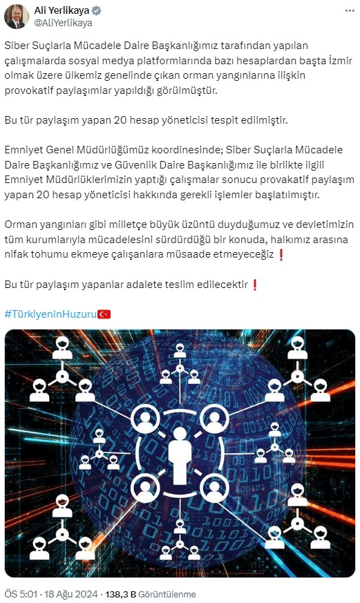 “Siber Suçlarla Mücadele Daire Başkanlığımız tarafından yapılan çalışmalarda sosyal medya platformlarında bazı hesaplardan başta İzmir olmak üzere ülkemiz genelinde çıkan orman yangınlarına ilişkin provokatif paylaşımlar yapıldığı görülmüştür. Bu tür paylaşım yapan 20 hesap yöneticisi tespit edilmiştir.Emniyet Genel Müdürlüğümüz koordinesinde; Siber Suçlarla Mücadele Daire Başkanlığımız ve Güvenlik Daire Başkanlığımız ile birlikte ilgili Emniyet Müdürlüklerimizin yaptığı çalışmalar sonucu provakatif paylaşım yapan 20 hesap yöneticisi hakkında gerekli işlemler başlatılmıştır.Orman yangınları gibi milletçe büyük üzüntü duyduğumuz ve devletimizin tüm kurumlarıyla mücadelesini sürdürdüğü bir konuda, halkımız arasına nifak tohumu ekmeye çalışanlara müsaade etmeyeceğiz. Bu tür paylaşım yapanlar adalete teslim edilecektir”