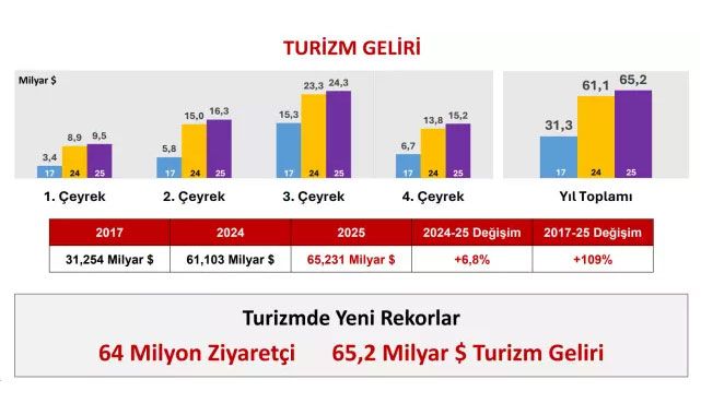 Sunumda paylaşılan verilere göre, 2017’den 2025’e turizm gelirinde yüzde 109’luk artış gerçekleşti. Türkiye, 2025’i hem gelir hem ziyaretçi sayısı açısından tarihî bir rekorla tamamlarken, Bakan Ersoy sektör temsilcilerine teşekkür ederek 2026 hedeflerine işaret etti.