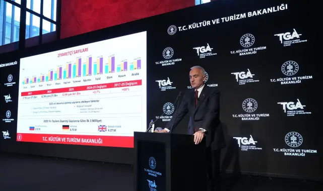 Ersoy, 2025’te Türkiye’yi 63 milyon 941 bin ziyaretçinin ağırladığını ve kişi başı harcamanın ortalama 100 dolara yükseldiğini söyledi. En çok turist gönderen ülkeler ise sırasıyla Rusya, Almanya ve Birleşik Krallık oldu.