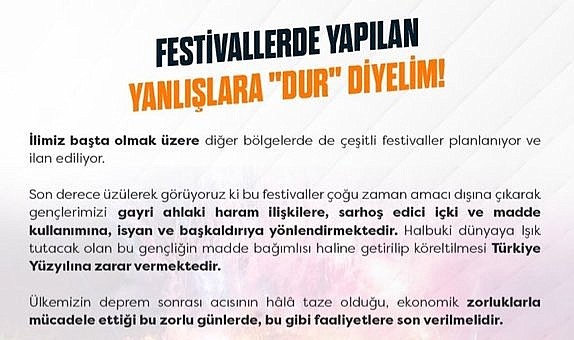 Bildiride şu ifadeler yer aldı; “Son derece üzülerek görüyoruz ki bu festivaller çoğu zaman amacı dışına çıkarak gençlerimizi gayri ahlaki haram ilişkilere, sarhoş edici içki ve madde kullanımına, isyan ve başkaldırıya yönlendirmektedir. Halbuki dünyaya ışık tutacak olan bu gençliğin madde bağımlısı haline getirilip köreltilmesi Türkiye Yüzyılı’na zarar vermektedir.