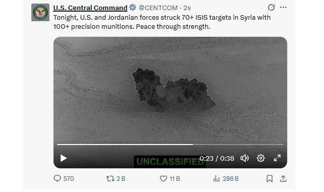 CENTCOM, sosyal medya hesaplarından askeri üslerden havalanan savaş jetleri ve helikopterlerin görüntülerini yayımladı. Açıklamada, operasyonun DEAŞ’ın Suriye’deki mühimmat kapasitesi ve altyapısını hedef aldığı vurgulandı.