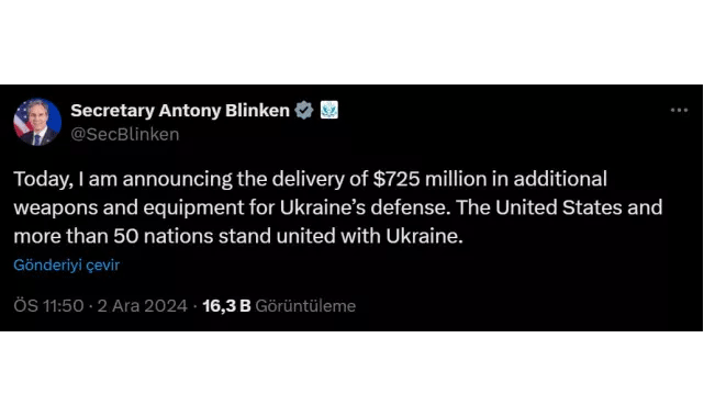 Blinken, sosyal medya hesabından yaptığı duyuruda şu ifadeleri kullandı: “Bugün, Ukrayna’nın savunması için 725 milyon dolarlık ek silah ve teçhizat teslimatını duyuruyorum. Amerika Birleşik Devletleri ve 50’den fazla ülke Ukrayna ile birleşmiş durumda.”