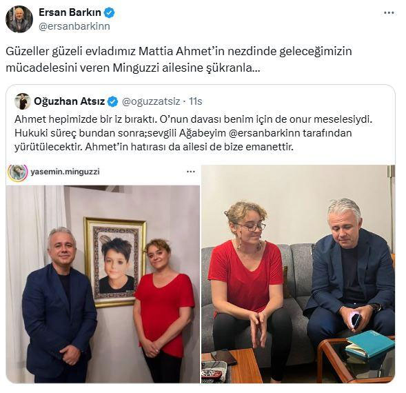 Avukat Barkın, sosyal medya hesabından yaptığı paylaşımda, Ahmet Mattia Minguzzi’nin annesi Yasemin Minguzzi ile çektirdiği bir fotoğrafı alıntılayarak, “Güzeller güzeli evladımız Mattia Ahmet’in nezdinde geleceğimizin mücadelesini veren Minguzzi ailesine şükranla…” ifadelerini kullandı.