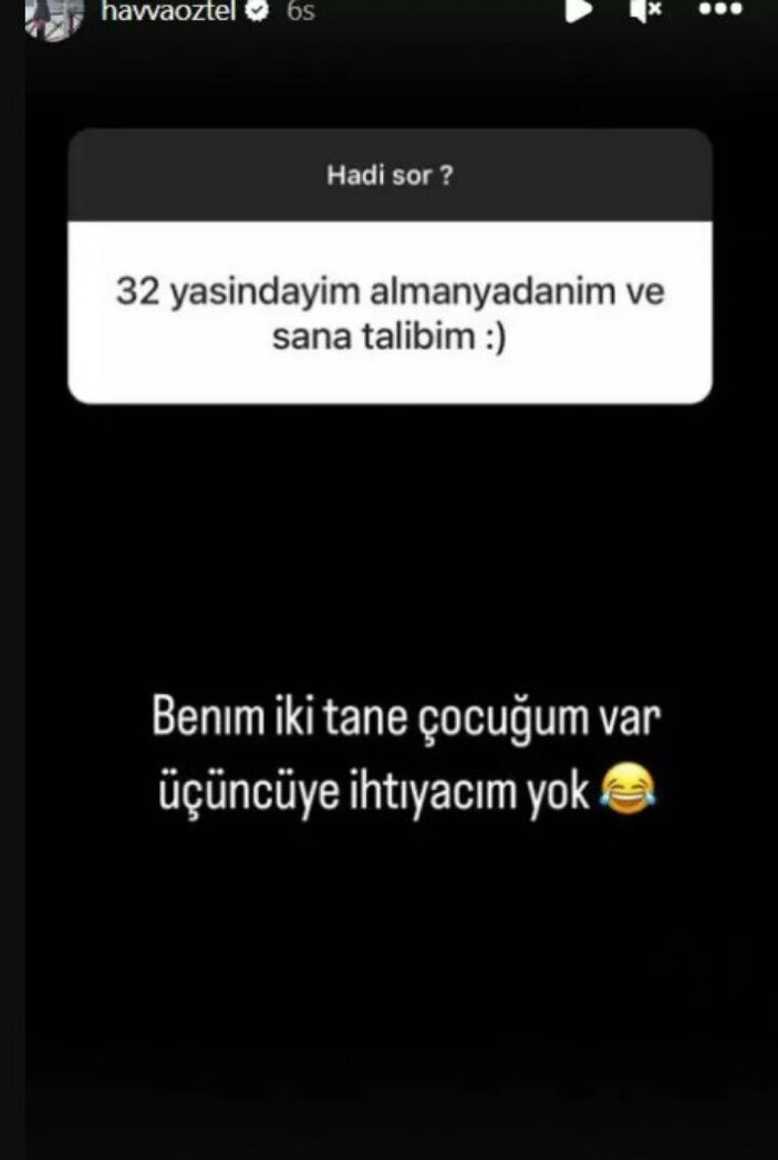 Havva Öztel, Amerika’ya yerleştikten sonra hayranlarından gelen soruları yanıtladığı bir paylaşımda, bir takipçisinin “Sana talibim” mesajını paylaştı. Ancak Öztel, “Benim iki çocuğum var, üçüncüye ihtiyacım yok” yanıtıyla bu teklifi geri çevirdi.