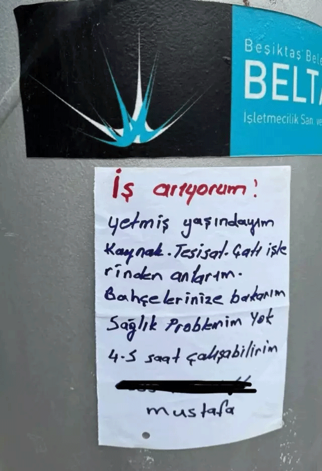 Beşiktaş’ta bir duvara asılan iş ilanı, görenleri derinden etkiledi. 70 yaşındaki Mustafa isimli bir vatandaş, geçinmek için iş aradığını belirttiği ilanda, “İş arıyorum: 70 yaşındayım. Kaynak, tesisat, çatı işlerinden anlarım. Bahçelerinize bakarım. Sağlık problemim yok. 4-5 saat çalışabilirim” ifadelerini kullandı.