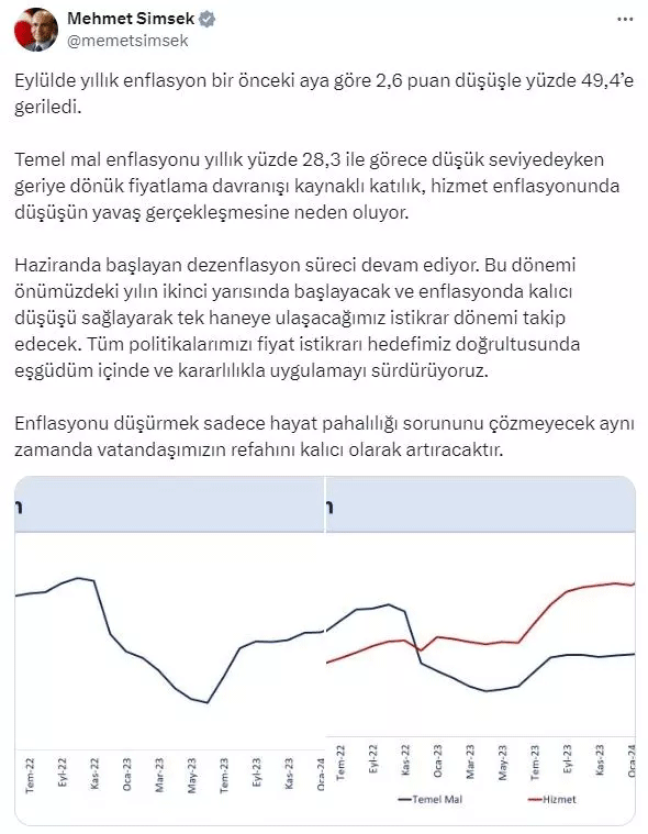 Bakan Şimşek, Eylül ayı enflasyon verilerini değerlendirerek, “Eylülde yıllık enflasyon, bir önceki aya göre 2,6 puan düşüşle yüzde 49,4’e geriledi. Temel mal enflasyonu yıllık yüzde 28,3 ile görece düşük seviyede. Ancak, geriye dönük fiyatlama davranışlarındaki katılık, hizmet enflasyonundaki düşüşü yavaşlatıyor” şeklinde konuştu.