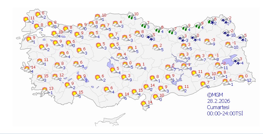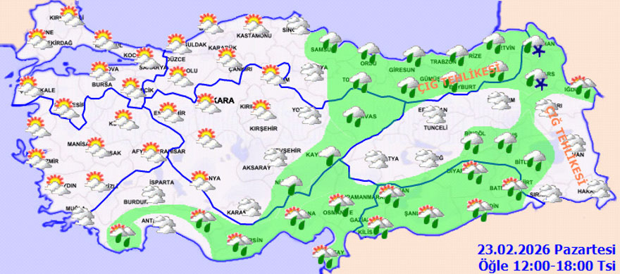 Sivas, Kars, Ardahan, Ağrı, Erzurum, Muş, Bitlis ve Iğdır çevrelerinde ise kar yağışı öngörülüyor. İç ve doğu bölgelerde buzlanma ve don tehlikesi devam ederken, Doğu Karadeniz’in iç kesimlerinin yüksekleri ile Doğu Anadolu’nun doğusundaki eğimli ve yüksek kar örtüsüne sahip bölgelerde çığ tehlikesi sürüyor.