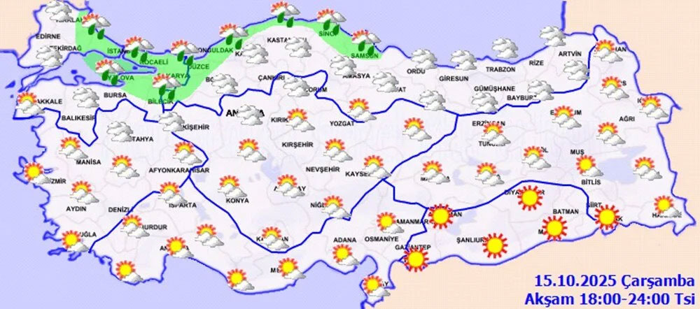 Marmara’nın doğusu, Batı Karadeniz ve Samsun çevreleri ile Doğu Karadeniz’in iç kesimlerinin yüksekleri yağmur ve sağanak yağışlı geçecek.