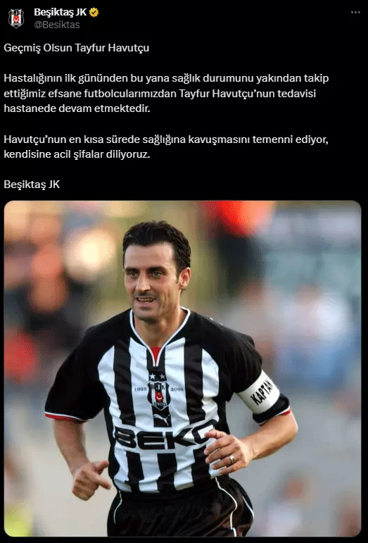 Beşiktaş taraftarları başta olmak üzere tüm futbolseverler, sosyal medyada Tayfur Havutçu’ya geçmiş olsun dileklerini ileterek, ünlü futbolcuya moral ve destek yağdırdı! Türk futbolunun efsane ismi için iyileşme temennileri paylaşan sevenleri, Havutçu’nun bir an önce sağlığına kavuşmasını diliyor. Beşiktaş kulübü de konuya ilişkin resmi açıklama yaparak, “Geçmiş Olsun Tayfur Havutçu” ifadeleriyle, efsane futbolcularının tedavisinin hastanede sürdüğünü ve sağlık durumunu yakından takip ettiklerini belirtti. Siyah-beyazlılardan yapılan açıklamada, “Havutçu’nun en kısa sürede sağlığına kavuşmasını temenni ediyor, kendisine acil şifalar diliyoruz” denildi.
