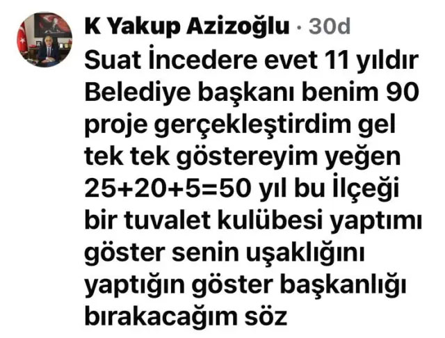 Yol tartışmasını haberleştiren gazeteci Suat İncedere’nin sosyal medya paylaşımının ardından, Çıldır Belediye Başkanı Yakup Azizoğlu’nun verdiği yanıt yeni bir tartışmanın fitilini ateşledi.Başkan Azizoğlu, haberin altına yaptığı yorumda gazeteciye hitaben, “Evet, 11 yıldır belediye başkanı benim. 90 proje gerçekleştirdim. Gel tek tek göstereyim yeğen. 25+20+5=50 yıl bu ilçeye bir tuvalet kulübesi yaptı mı göster” ifadelerini kullandı.Gazeteci Suat İncedere ise cevabında, “O ne biçim konuşma başkan, yeğen, uşak falan? Ben gazeteciyim. Beni oraya çağıran ve konuşan başkanlara da iki kelime etmedin, beni neden hedef seçtin? Biz yapılanı da yapılmayanı da görüyoruz. Sözlerini düzelt” diyerek tepki gösterdi.