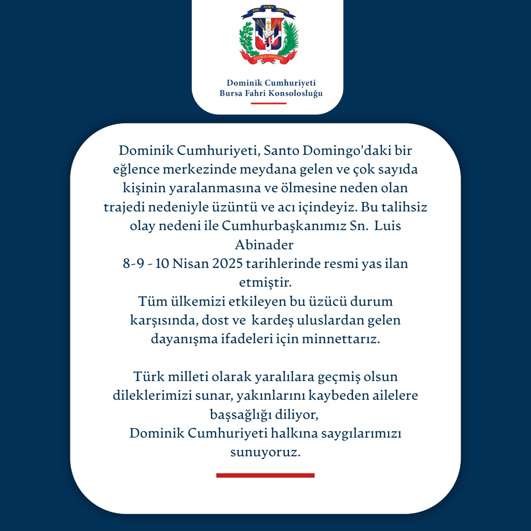 Dominik Cumhuriyeti Bursa Fahri Konsolosluğu yaşanan olay sonrasında: “Dominik Cumhuriyeti, Santo Domingo’daki bir eğlence merkezinde meydana gelen ve çok sayıda kişinin yaralanmasına ve ölmesine neden olan trajedi nedeniyle üzüntü ve acı içindeyiz. Bu talihsiz olay nedeni ile Cumhurbaşkanımız Sn. Luis Abinader 8-9-10 Nisan 2025 tarihlerinde resmi yas ilan etmiştir. Tüm ülkemizi etkileyen bu üzücü durum karşısında, dost ve kardeş uluslardan gelen dayanışma ifadeleri için minnettarız. Türk milleti olarak yaralılara geçmiş olsun dileklerimizi sunar, yakınlarını kaybeden ailelere başsağlığı diliyor, Dominik Cumhuriyeti halkına saygılarımızı sunuyoruz.