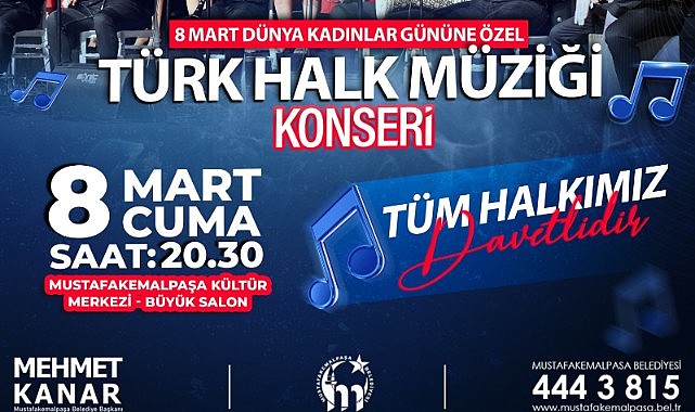 Halk Müziği Konseri, 8 Mart Cuma saat 20:30’da Mustafakemalpaşa Kültür Merkezinde ücretsizdir.