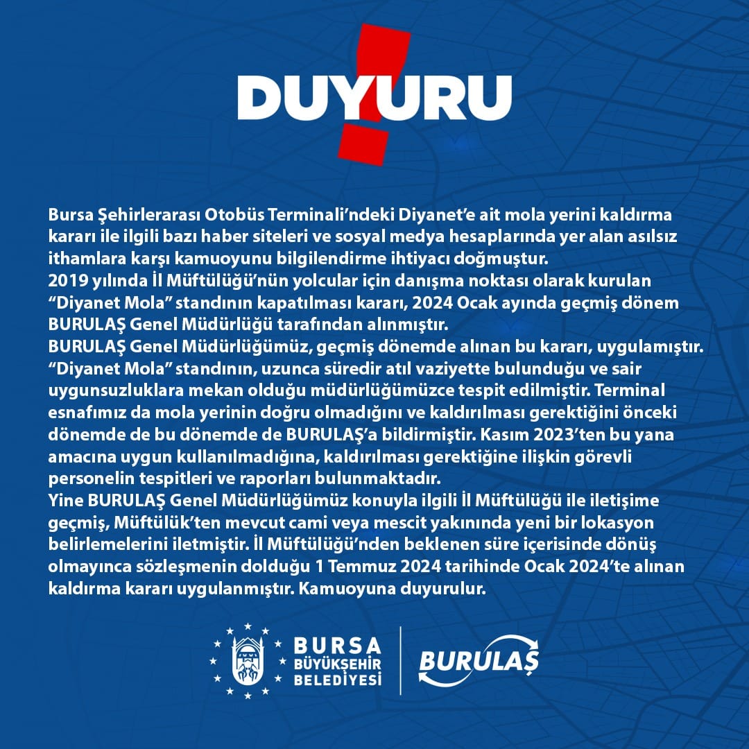 “Bursa Şehirlerarası Otobüs Terminali’ndeki Diyanet’e ait mola yerini kaldırma kararıyla ilgili bazı haber siteleri ve sosyal medya hesaplarında yer alan asılsız ithamlara karşı kamuoyunu bilgilendirme ihtiyacı doğmuştur. 2019 yılında İl Müftülüğü’nün yolcular için danışma noktası olarak kurulan ‘Diyanet Mola’ standının kapatılması kararı, 2024 Ocak ayında geçmiş dönem BURULAŞ Genel Müdürlüğü tarafından alınmıştır.
