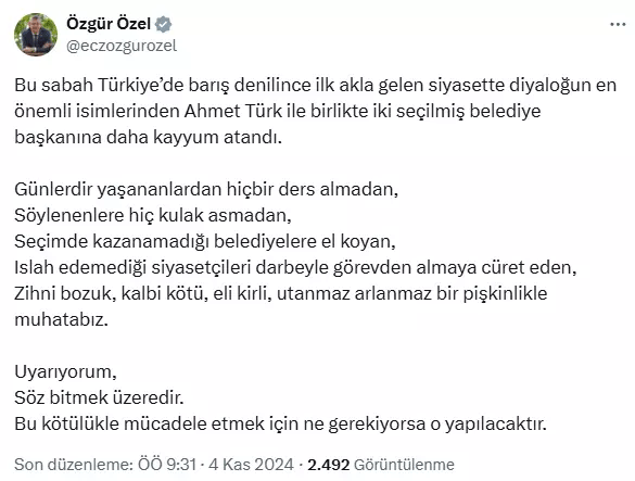 Özel paylaşımında “Bu sabah Türkiye’de barış denilince ilk akla gelen siyasette diyaloğun en önemli isimlerinden Ahmet Türk ile birlikte iki seçilmiş belediye başkanına daha kayyum atandı. Günlerdir yaşananlardan hiçbir ders almadan, söylenenlere hiç kulak asmadan, seçimde kazanamadığı belediyelere el koyan, ıslah edemediği siyasetçileri darbeyle görevden almaya cüret eden, zihni bozuk, kalbi kötü, eli kirli, utanmaz arlanmaz bir pişkinlikle muhatabız. Uyarıyorum, söz bitmek üzeredir. Bu kötülükle mücadele etmek için ne gerekiyorsa o yapılacaktır” ifadelerini kullandı.