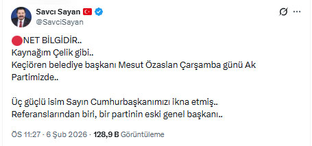 Aynı iddiaya ilişkin AK Partili Savcı Sayan da açıklama yaptı. Transfer söylentilerini doğrulayan Sayan, Özarslan’ın AK Parti’ye katılacağı tarihi paylaştı. Sayan, “Kaynağım çelik gibi. Keçiören Belediye Başkanı Mesut Özarslan çarşamba günü AK Parti’mizde. Üç güçlü isim Sayın Cumhurbaşkanımızı ikna etmiş” dedi.