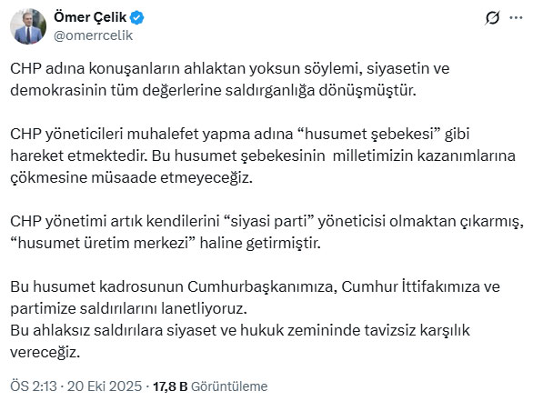 Çelik, CHP yöneticilerinin “siyasi nezaketi aşan” bir dil kullandığını belirterek, “CHP yönetimi artık kendilerini siyasi parti yöneticisi olmaktan çıkarmış, husumet üretim merkezi haline getirmiştir. Milletimizin kazanımlarına çökülmesine izin vermeyeceğiz” dedi.