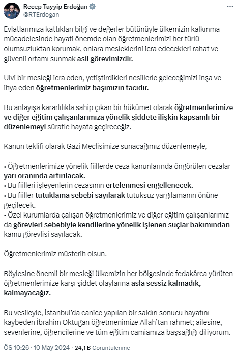 Ulvi bir mesleği icra eden, yetiştirdikleri nesillerle geleceğimizi inşa ve ihya eden öğretmenlerimiz başımızın tacıdır.Bu anlayışa kararlılıkla sahip çıkan bir hükûmet olarak öğretmenlerimize ve diğer eğitim çalışanlarımıza yönelik şiddete ilişkin kapsamlı bir düzenlemeyi süratle hayata geçireceğiz.Kanun teklifi olarak Gazi Meclisimize sunacağımız düzenlemeyle,• Öğretmenlerimize yönelik fiillerde ceza kanunlarında öngörülen cezalar yarı oranında artırılacak.• Bu fiilleri işleyenlerin cezasının ertelenmesi engellenecek.• Bu fiiller tutuklama sebebi sayılarak tutuksuz yargılamanın önüne geçilecek.• Özel kurumlarda çalışan öğretmenlerimiz ve diğer eğitim çalışanlarımız da görevleri sebebiyle kendilerine yönelik işlenen suçlar bakımından kamu görevlisi sayılacak.Öğretmenlerimiz müsterih olsun.Böylesine önemli bir mesleği ülkemizin her bölgesinde fedakârca yürüten öğretmenlerimize karşı şiddet olaylarına asla sessiz kalmadık, kalmayacağız.Bu vesileyle, İstanbul’da canice yapılan bir saldırı sonucu hayatını kaybeden İbrahim Oktugan öğretmenimize Allah’tan rahmet; ailesine, sevenlerine, öğrencilerine ve tüm eğitim camiamıza başsağlığı diliyorum.” dedi.