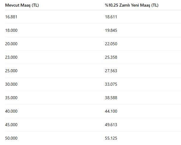 Memur ve memur emeklileri ise toplu sözleşmeden doğan yüzde 11 zam hakkına ek olarak enflasyon farkı alacak. İlk dört aylık verilere göre memur zammı en az yüzde 16,55 seviyesinde olacak. Yıl sonu enflasyon tahminleri gerçekleşirse, memurların zam oranı yüzde 19,39 – 19,59 aralığında olacak.Ayrıca taban aylıklara brüt 1.000 TL ek zam yapılacak. Bu tutar, memurların maaşlarına farklı oranlarda yansıyacak. Kesin artış oranları ise Kasım ve Aralık enflasyon verilerinin açıklanmasının ardından netleşecek.