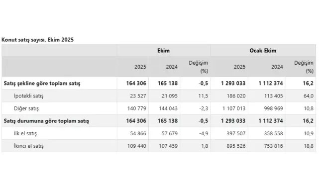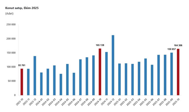 Ocak-Ekim 2025 döneminde ise konut satışları yıllık bazda %16,2 artarak 1.293.033 oldu.
