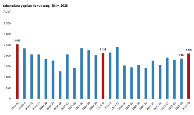 Ekim 2025’te yabancılara konut satışları %0,8 azalarak 2.106 adet olarak kaydedildi. Toplam satış içindeki payı %1,3 oldu.En fazla satış yapılan iller:
