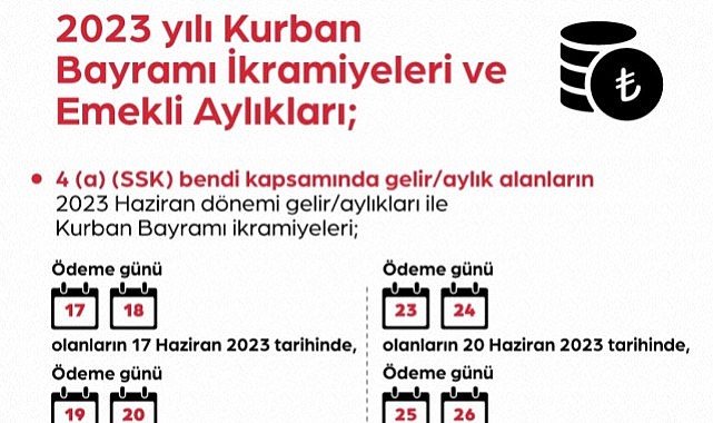 Çalışma ve Sosyal Güvenlik Bakanlığı, emekli aylıkları ve bayram ikramiyelerinin 17-23 Haziran tarihleri arasında hesaplara yatırılacağını duyurdu. SSK KAPSAMINDA OLANLARIN ÖDEME GÜNLERİ: Ödeme günü 17-18 olanlar 17 Haziran’da, Ödeme günü 19-20 olanlar 18 Haziran’da Ödeme günü 21-22 olanlar 19 Haziran’da, Ödeme 23-24 olanlar 20 Haziran’da, Ödeme günü 25-26 olanlar 21 Haziran’da aylıklarını alacak.