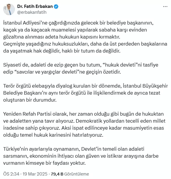 Erbakan, İmamoğlu’nun sabaha karşı evinden gözaltına alınmasını, “hukukun kapısını kırmak” olarak nitelendirerek, “Geçmişte yaşadığınız hukuksuzlukları, daha da üst perdeden başkalarına yaşatmak hak değildir, haklı bir tutum da değildir” dedi. Söz konusu tutumun, “hukuk devleti”ni yok edip yerine “savcılar ve yargıçlar devleti” kurmaya yönelik bir adım olduğunu ifade etti.