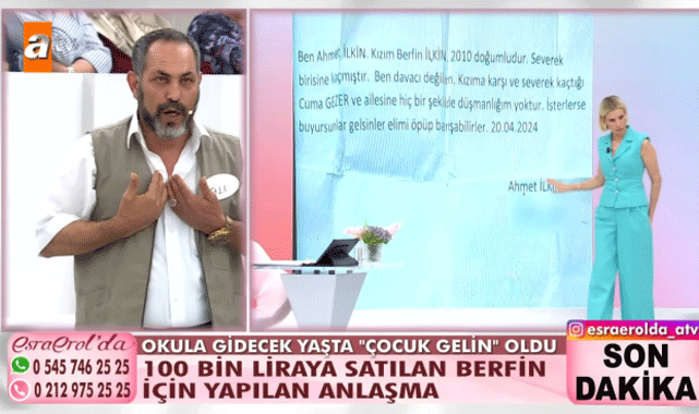 Canlı yayında gösterilen belgede, Berfin’in babası Ahmet İlkin’in el yazısıyla yazılmış bir notu vardı. Notunda şu ifadeler yer alıyordu: “Ben Ahmet İlkin, kızım Berfin İlkim’in 2010 doğumlu olduğunu belirtirim. O, severek birisine kaçtı. Ben herhangi bir dava açmıyorum. Kızıma ve kaçtığı Cuma Gezer ile ailesine karşı düşmanlık beslemiyorum, hatta onlarla barışmaya hazırım. İsterlerse gelip elimi öpebilirler.” Ahmet İlkin’in bu notu imzalamış olduğu da belgede yer alıyordu.