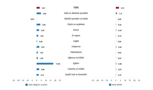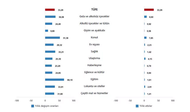 Bu grupların yıllık enflasyona katkısı da dikkat çekti. Gıdanın yıllık enflasyona etkisi %8,60, konutun %7,85, ulaştırmanın ise %4,15 oldu.