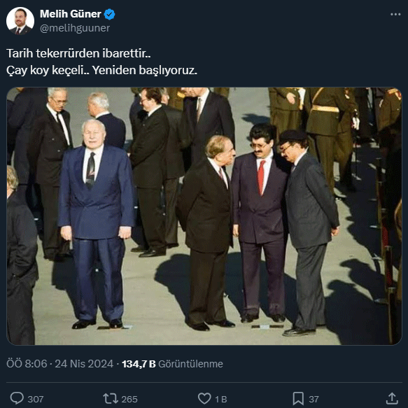 YRP Gençlik Kolları Başkanı Melih Güner, Erbakan’ın çaya davet edilmemesine dair dikkat çeken bir yanıt verdi. Güner, sosyal medya hesabından Turgut Özal, Alparslan Türkeş ve Bülent Ecevit’in sohbet ettiği, Necmettin Erbakan’ın ise gruptan uzakta kenarda durduğu bir fotoğrafı paylaştı. Yeniden Refahlı Güner, hükümete göndermede bulunduğu fotoğrafa “Tarih tekerrürden ibarettir. Çay koy Keçeli, Yeniden başlıyoruz.” notunu düştü.