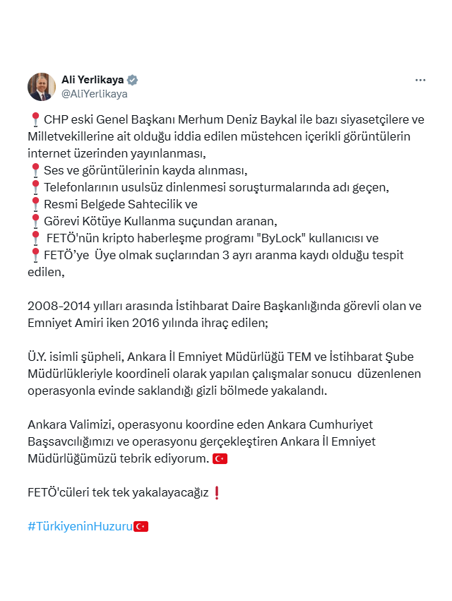 İçişleri Bakanı Ali Yerlikaya, FETÖ’nün kaset kumpası ve suç örgütü faaliyetlerine dair önemli bir gelişmeyi duyurdu. Bakan, X hesabından yaptığı paylaşımda, eski CHP Genel Başkanı Merhum Deniz Baykal ile birçok siyasetçi ve milletvekiline ait olduğu öne sürülen müstehcen içerikli görüntülerin internet üzerinden yayınlanmasının ardından başlatılan soruşturmalara ilişkin açıklamada bulundu. Yerlikaya, “Ses ve görüntülerinin kayda alınması, telefonlarının usulsüz dinlenmesi, resmi belgede sahtecilik ve görevi kötüye kullanma suçlarıyla bağlantılı olarak adı geçen, FETÖ’nün gizli haberleşme ağı ‘ByLock’ kullanıcısı ve örgüte üye olma suçlarından 3 ayrı aranma kaydı bulunan Ü.Y. isimli şüphelinin, 2008-2014 yılları arasında İstihbarat Daire Başkanlığı’nda görevli olduğunu ve 2016’da ihraç edildiğini” belirtti. Yapılan operasyonla şüphelinin, Ankara İl Emniyet Müdürlüğü TEM ve İstihbarat Şube Müdürlükleri tarafından koordine edilen çalışmalar sonucu evinde saklandığı gizli bir bölmede yakalandığını açıkladı. Bakan Yerlikaya, operasyonu koordine eden Ankara Valisi, Ankara Cumhuriyet Başsavcılığı ve emniyet güçlerini tebrik ederek, “FETÖ’cüleri tek tek yakalayacağız.” ifadelerini kullandı.
