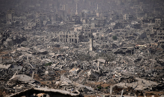 Gazze’nin kuzeyinde ayakta kalan birkaç bina, toprağın içinden çıkmış kırık kemikler gibi yükseliyor. Etraflarında bulunan ve bir zamanlar yoğun nüfuslu olan mahalle, artık tamamen moloz ve toza dönmüş durumda.