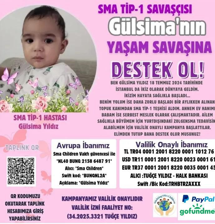 Gülsima’nın hayata tutunabilmesi için yurt dışında uygulanan ve milyonlarca dolar maliyeti olan gen tedavisine ulaşması gerekiyor. Ancak bu tedaviye erişebilmek için kampanyanın kısa sürede başarıya ulaşması şart. Yıldız ailesi, toplumdan duyarlılık bekliyor ve küçük kızlarının yaşam mücadelesine destek olunması çağrısında bulunuyor.