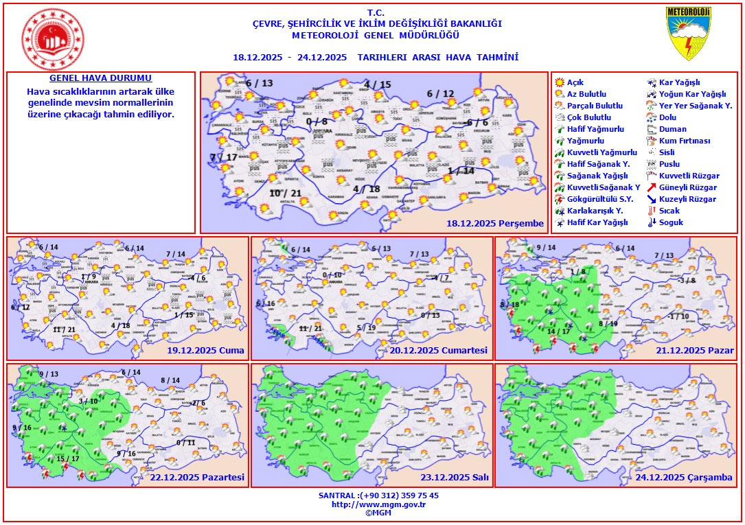 Hava sıcaklıklarının ülke genelinde mevsim normallerinin üzerinde seyretmesi bekleniyor. Ancak özellikle gece saatlerinde yurdun iç ve doğu kesimlerinde buzlanma ve don olaylarına karşı dikkatli olunması isteniyor.