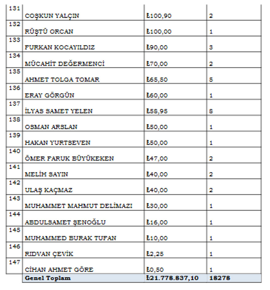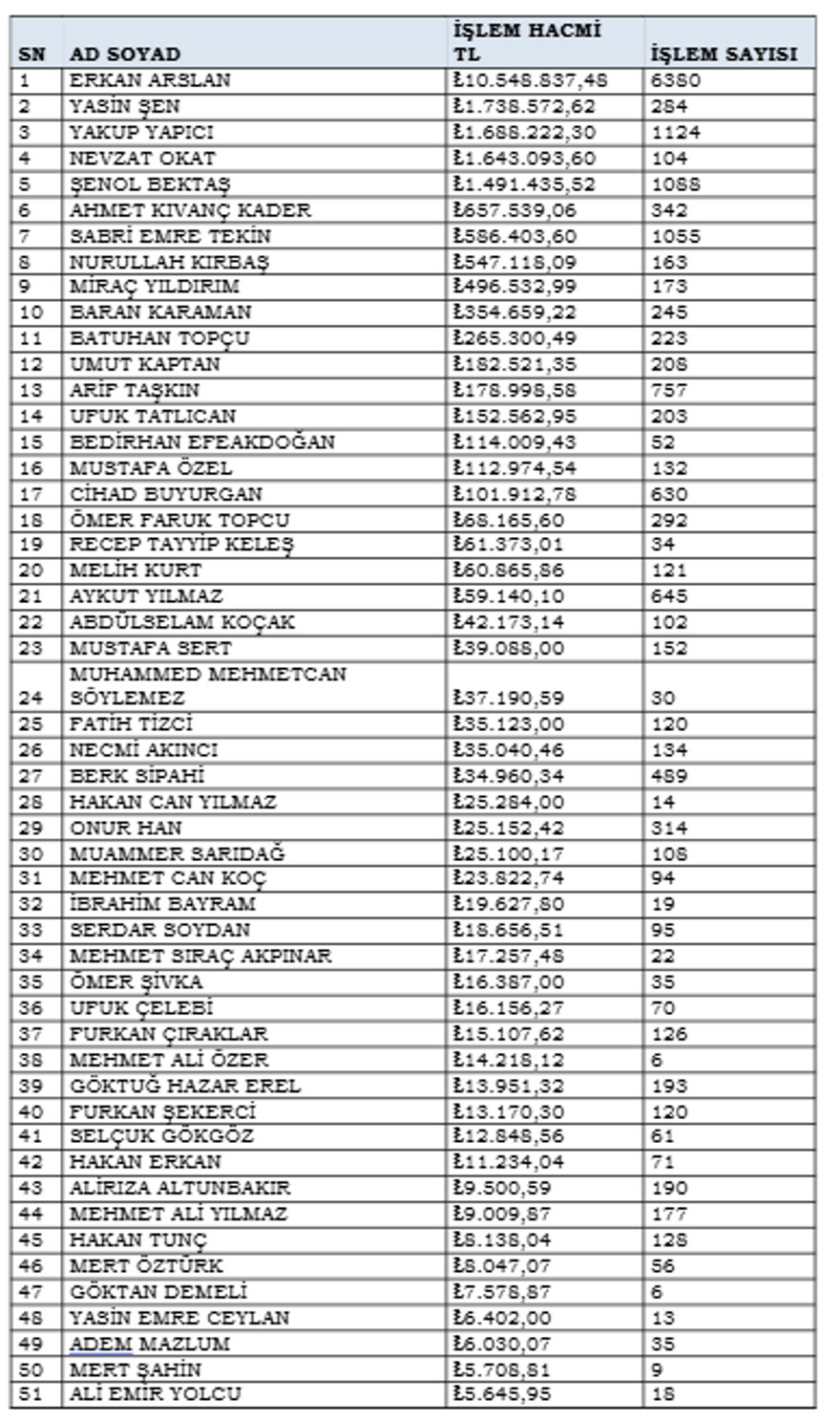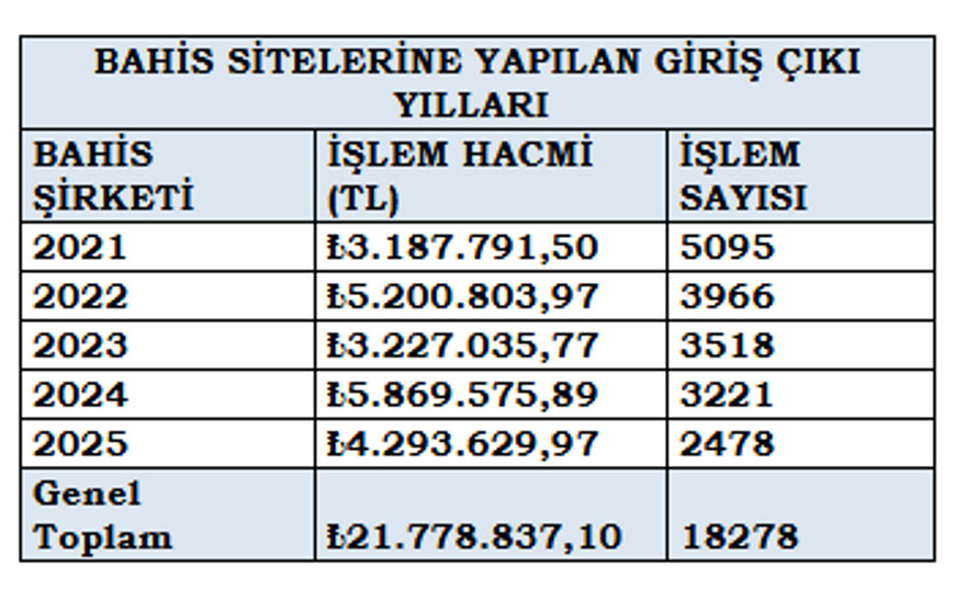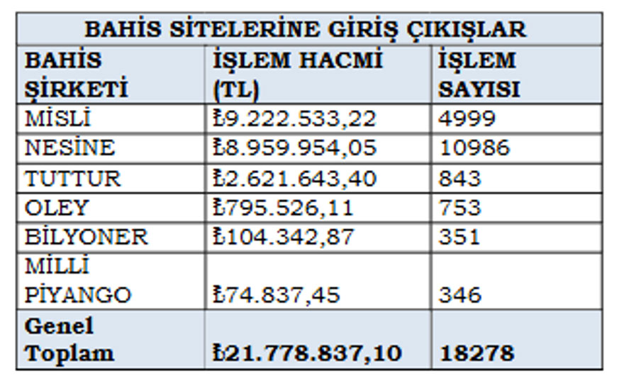 İstanbul Cumhuriyet Başsavcılığı tarafından yapılan açıklamanın ardından, bahis soruşturmasına ilişkin MASAK raporu kamuoyuyla paylaşıldı. MASAK’ın bankacılık transfer verilerine göre; 147 hakem, MİSLİ, NESİNE, TUTTUR, OLEY, BİLYONER ve MİLLİ PİYANGO gibi şans oyunları sitelerine toplam 18 bin 278 işlemde 21 milyon 778 bin 837 TL’lik para giriş-çıkış işlemi gerçekleştirdi.