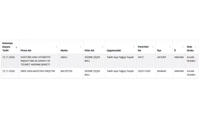 Tarım ve Orman Bakanlığı, 12 Kasım tarihinde yayımladığı yeni listeyle, zincir marketlerde ve e-ticaret sitelerinde satılan ballarda taklit ve tağşiş tespit edilen iki ünlü firmayı ifşa etti. Söz konusu listede, Ankara merkezli “Abalı” ve “Balpetek” markalı ballarda yapılan hileler gün yüzüne çıktı. Bakanlık, bu firmaların ürünlerinde tağşiş ve taklit yapıldığını belirterek, tüketicileri uyardı. Hatırlatmak gerekirse, önceki listede ise gıda sahtekârlarının dönerde dil kullandıkları ortaya çıkmıştı. Bakanlık, sahtecilik yapan firmalara göz açtırmıyor ve halkı bilinçlendirmek adına bu tür açıklamalara devam ediyor.