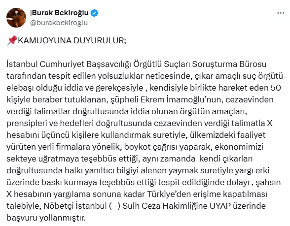 “Şüpheli Ekrem İmamoğlu’nun, iddia olunan suç örgütünün amaçları, prensipleri ve hedefleri doğrultusunda cezaevinden verdiği talimatla X hesabını üçüncü kişilere kullandırmak suretiyle, ülkemizdeki faaliyet gösteren yerli firmalara yönelik boykot çağrısı yaparak, ekonomimizi sekteye uğratmaya teşebbüs ettiği, aynı zamanda kendi çıkarları doğrultusunda halkı yanıltıcı bilgiyi alenen yaymak suretiyle yargı erki üzerinde baskı kurmaya teşebbüs ettiği tespit edilmiştir. Bu sebeple, X hesabının yargılama sonuna kadar Türkiye’den erişime kapatılması talebiyle, Nöbetçi İstanbul Sulh Ceza Hakimliğine UYAP üzerinden başvuru yapılmıştır.”