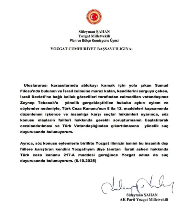 Bu gelişme üzerine AK Parti Yozgat Milletvekili Süleyman Şahan, sosyal medya hesabından yaptığı açıklamayla İsrail askerine yönelik suç duyurusunda bulunduğunu duyurdu. Şahan, Zeynep Tekocak’a yönelik eylemler nedeniyle Türk Ceza Kanunu’nun ilgili maddeleri kapsamında failler hakkında işlem başlattığını ifade etti. Ayrıca, “Yozgatlıyım” iddiasında bulunan İsrail askerine karşı da TCK 217/A maddesi gereğince Yozgat ve Yozgatlı hemşehrileri adına suç duyurusunda bulunduğunu belirtti.Şahan, açıklamasında şu ifadelere yer verdi: