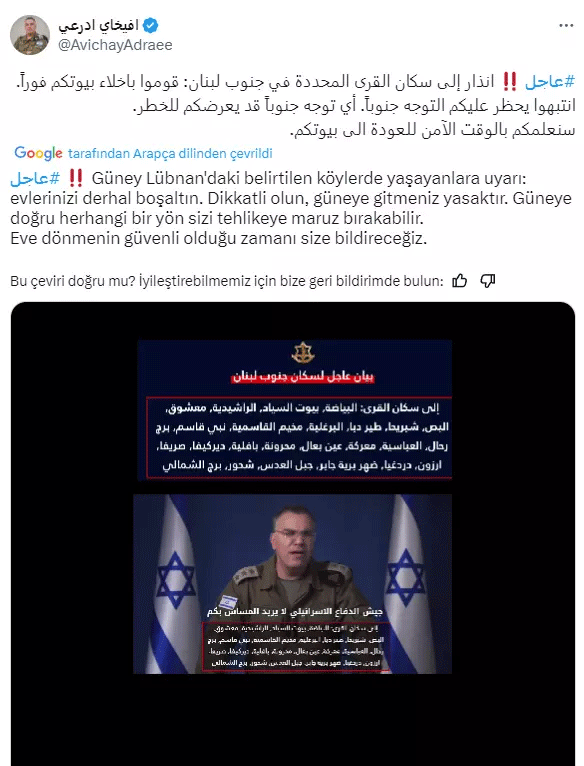İsrail ordusu sözcüsü Avichai Adraee, Lübnan’ın güneyinde saldırı düzenlenecek bölgeleri açıkladı. Saldırılacak yerler arasında El-Beyada, Buyut es-Siyad, Er-Raşidiye, Maşuk, El-Bes, Şubriha, Teyr Dibbe, El-Burğuliye, Muhayyem el-Kasımiye, Nebi Kasım, Burc Rihal, El-Abbasiye, Muareke, Ayn el-Baal, Mahrune, Bafliye, Deyr Kifa, Sarife, Arzun, Derdeğiye, Dahr Bariye Cabir, Cebel el-Ades, Şuhur ve Burc eş-Şimali bulunuyor. Andraee, bölgedeki sivillere güneye gitmemeleri yönünde uyarılarda bulunarak, “Hizbullah’ın askeri hedeflerine yönelik saldırılar düzenlenecek.” dedi. Ayrıca, Lübnanlı sivillerin güvenliği için Avali Nehri’nin kuzeyine geçmeleri gerektiğini belirtti. Adraee, “Evlerinize dönmeniz için güvenli vakti size bildireceğiz.” şeklinde bir açıklama yaptı.