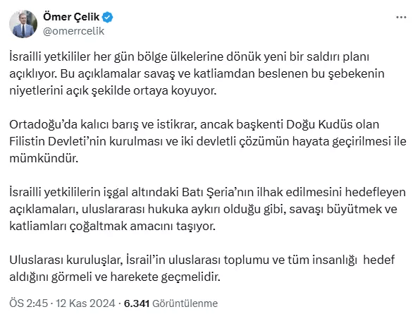 Resmi X hesabından bir paylaşım yapan Çelik “İsrailli yetkililer her gün bölge ülkelerine dönük yeni bir saldırı planı açıklıyor. Bu açıklamalar savaş ve katliamdan beslenen bu şebekenin niyetlerini açık şekilde ortaya koyuyor. Ortadoğu’da kalıcı barış ve istikrar, ancak başkenti Doğu Kudüs olan Filistin Devleti’nin kurulması ve iki devletli çözümün hayata geçirilmesi ile mümkündür. İsrailli yetkililerin işgal altındaki Batı Şeria’nın ilhak edilmesini hedefleyen açıklamaları, uluslararası hukuka aykırı olduğu gibi, savaşı büyütmek ve katliamları çoğaltmak amacını taşıyor. Uluslarası kuruluşlar, İsrail’in uluslarası toplumu ve tüm insanlığıhedef aldığını görmeli ve harekete geçmelidir” dedi.