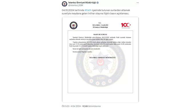 İstanbul Emniyet Müdürlüğü’nden konu ile ilgili açıklama geldi. Yapılan açıklamada, şahsın olaydan birkaç saat önce bir kadını daha öldürdüğü belirtildi. Açıklamada “İstanbul Emniyet Müdürlüğü görevlilerince, 04.10.2024 tarihinde Fatih içesinde bulunan surlardan atlamak suretiyle meydana gelen intihar olayı ile ilgili olarak; yapılan çalışmalarda; S.C.(19) isimli şahsın surlardan atlayarak intihar ettiği, intihar etmeden önce saat 15.30 sıralarında Eyüpsultan ilçesinde A.H.(19) isimli kadını daha sonra 16.00 sıralarında Fatih ilçesinde İ.U.(19) isimli kadını öldürdüğü tespit edilmiştir. Konu ile ilgili soruşturma devam etmektedir. Kamuoyunun bilgisine sunulur.”