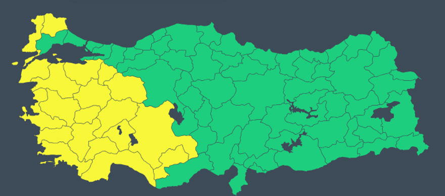 Meteoroloji, sağanak ve fırtına beklenen 20 şehir için sarı kodlu uyarıda bulundu. Uyarı verilen şehirler:Afyonkarahisar, Antalya, Aydın, Balıkesir, Bilecik, Burdur, Bursa, Çanakkale, Denizli, Edirne, Eskişehir, Isparta, İzmir, Kırklareli, Konya, Kütahya, Manisa, Muğla, Uşak ve Karaman.