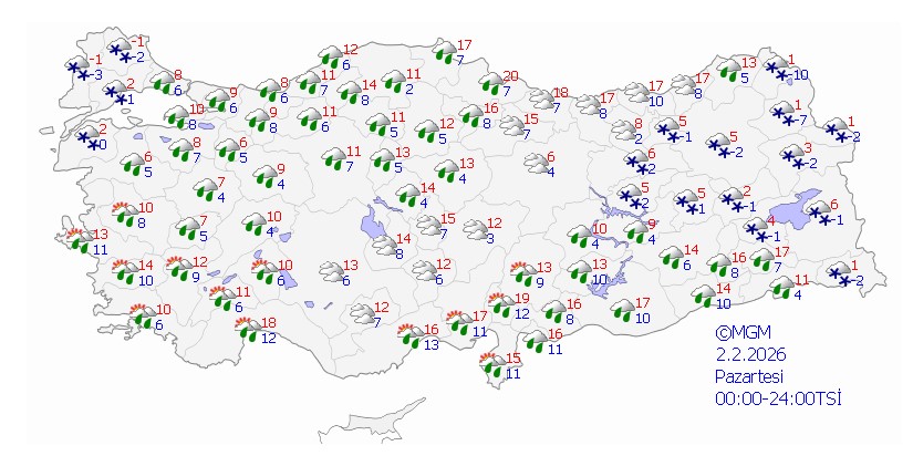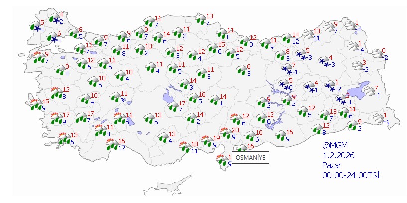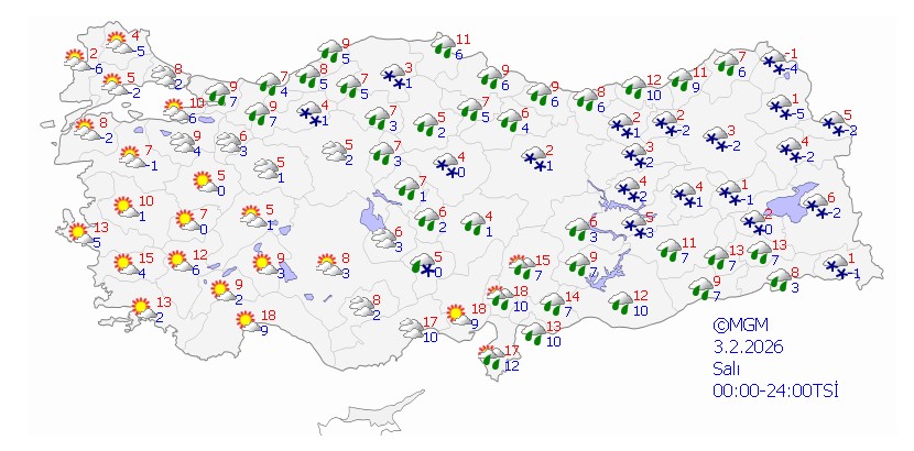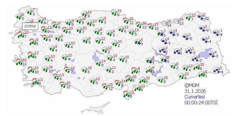 Meteorolojiye göre, bugün Marmara, Ege, Akdeniz, Batı Karadeniz, İç Anadolu’nun kuzey ve batısı ile Güneydoğu Anadolu’nun batısı ve Nevşehir ile Karaman çevrelerinde yağmur ve sağanak bekleniyor.Yağışların özellikle Marmara’nın batısı, Kıyı Ege ve Batı Akdeniz ile Manisa ve Denizli’de yerel olarak kuvvetli olması öngörülüyor.Rüzgarın Marmara’nın güney ve batısı, Ege ve Batı Akdeniz’de güney yönlerden kuvvetli ve zaman zaman fırtına (50-80 km/saat) şeklinde eseceği tahmin ediliyor.