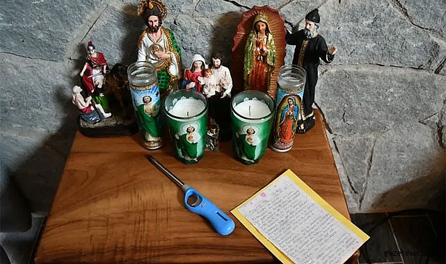 El Mencho’nun villasındaki odalardan birinde derme çatma bir sunak yer alıyordu. Sunakta Meksika’nın azizesi Guadalupe Bakiresi ve Aziz Jude Thaddeus’un figürleri bulundu. Aziz Thaddeus, Hristiyanlıkta “umutsuz durumların ve kaybedilmiş davaların hamisi” olarak biliniyor.Yemek masasının üzerinde, el yazısıyla yazılmış bir İncil pasajı ve parlak kırmızı fiyonklu küçük bir kutu dikkat çekti.