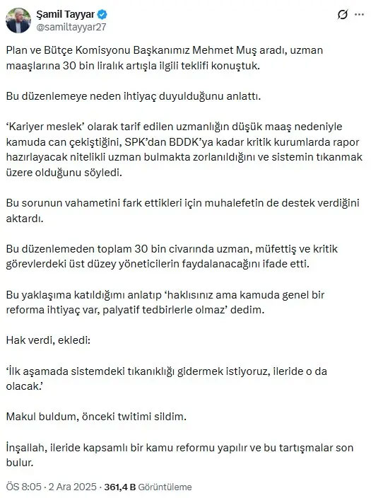 Eski AK Parti Milletvekili Şamil Tayyar, Plan ve Bütçe Komisyonu Başkanı Mehmet Muş ile yaptığı telefon görüşmesini paylaşarak düzenlemenin gerekçelerini aktardı. Tayyar’ın açıklamasına göre, Muş şu değerlendirmelerde bulundu:
