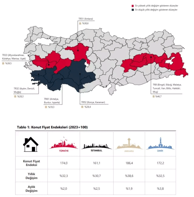 Kalite etkisinden arındırılmış fiyat değişimlerini yansıtan KFE, Mart ayında 174,0 seviyesine ulaştı. Büyükşehirler özelinde incelendiğinde ise konut fiyatları İstanbul’da yüzde 2,5, Ankara’da yüzde 1,9 ve İzmir’de yüzde 3,8 oranında arttı. Yıllık bazda ise İstanbul’da yüzde 30,7, Ankara’da yüzde 38,6, İzmir’de ise yüzde 32,5’lik artış kaydedildi.