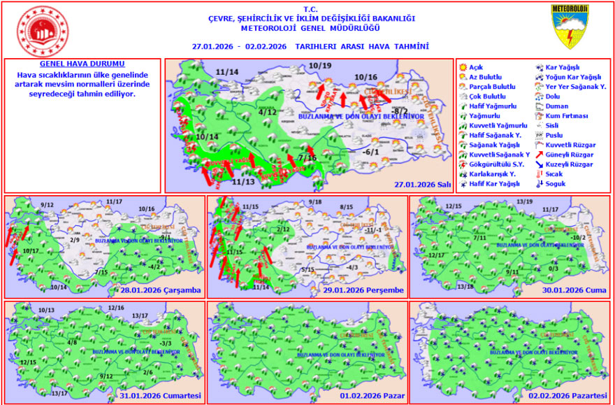 Ülke genelinde sıcaklıklar gelecek hafta beklenen soğuk havaya kadar yüksek seyredecek. Ancak yurdun büyük bölümünde şiddetli yağışlar etkili olacak. İstanbul’da lodosun yer yer sert esmesi ve yağmurun etkili olması bekleniyor. Kentte sıcaklık ise 14 derece civarında olacak. Başkent Ankara’da akşam saatlerinde yağmur görülecek, sıcaklık 12 derece olacak. İzmir ve Antalya’da kuvvetli yağış öngörülüyor. Meteoroloji, özellikle dolu ve hortum riskine karşı uyardı.