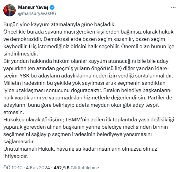 Ankara Büyükşehir Belediye Başkanı Mansur Yavaş kayyum atamaları ile ilgili X hesabından yaptığı açıklamada: “Hukukçu olarak görüşüm; TBMM’nin acilen ilk toplantıda yasa değişikliği yaparak görevden alınan başkanın yerine belediye meclisinden birinin seçilmesini sağlayıp seçmen iradesinin belediyeye yansımasını sağlamasıdır. Bugün yine kayyum atamalarıyla güne başladık. Öncelikle burada savunulması gereken kişilerden bağımsız olarak hukuk ve demokrasidir. Demokrasilerde bazen seçim kazanılır, bazen seçim kaybedilir. Hiç istemediğiniz birisini halk seçebilir. Önemli olan bunun içe sindirilmesidir. Bir yandan hakkında hüküm olanlar kayyum atanacağını bile bile aday yapılırken (en azından geçmiş yılların öngörüsü ile) diğer yandan idare-seçim-YSK bu adayların adaylıklarına neden izin verdiği sorgulanmalıdır. Milletin iradesinin bu şekilde yok sayılması artık seçmenin sandıktan iyice uzaklaşması sonucunu doğuracaktır. Bırakın belediye başkanlarını halk yaptıklarını ve yapamadıkları hizmetlerle değerlendirsin. Partiler de adaylarını buna göre belirleyip adeta meydan okur gibi aday tespit etmesin. Hukukçu olarak görüşüm; TBMM’nin acilen ilk toplantıda yasa değişikliği yaparak görevden alınan başkanın yerine belediye meclisinden birinin seçilmesini sağlayıp seçmen iradesinin belediyeye yansımasını sağlamasıdır. Unutulmamalı Hukuk, hava ile su kadar insanların olmazsa olmaz ihtiyacıdır.” dedi.