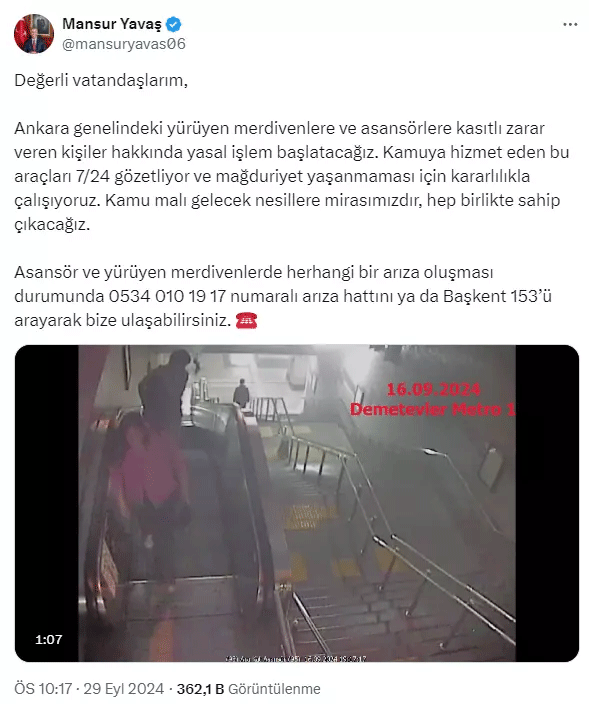 Yavaş, sosyal medya hesabından yaptığı paylaşımda, şu ifadeleri kullandı; “Değerli vatandaşlarım, Ankara genelindeki yürüyen merdivenlere ve asansörlere kasıtlı zarar veren kişiler hakkında yasal işlem başlatacağız. Kamuya hizmet eden bu araçları 7/24 gözetliyor ve mağduriyet yaşanmaması için kararlılıkla çalışıyoruz. Kamu malı gelecek nesillere mirasımızdır, hep birlikte sahip çıkacağız. Asansör ve yürüyen merdivenlerde herhangi bir arıza oluşması durumunda 0534 010 19 17 numaralı arıza hattını ya da Başkent 153’ü arayarak bize ulaşabilirsiniz.”