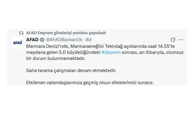 Depremin ardından AFAD’dan yapılan açıklamada, “Marmara Denizi’nde, Marmaraereğlisi Tekirdağ açıklarında saat 14.55’te meydana gelen 5.0 büyüklüğündeki deprem sonrası, an itibarıyla olumsuz bir durum bulunmamaktadır. Saha tarama çalışmaları devam etmektedir. Etkilenen vatandaşlarımıza geçmiş olsun dileklerimizi sunarız” denildi.