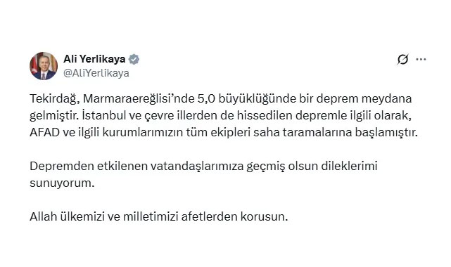 İçişleri Bakanı Ali Yerlikaya, “Tekirdağ Marmaraereğlisi’nde 5,0 büyüklüğünde bir deprem meydana gelmiştir. İstanbul ve çevre illerden de hissedilen depremle ilgili olarak, AFAD ve ilgili kurumlarımızın tüm ekipleri saha taramalarına başlamıştır. Depremden etkilenen vatandaşlarımıza geçmiş olsun dileklerimi sunuyorum. Allah ülkemizi ve milletimizi afetlerden korusun” dedi.